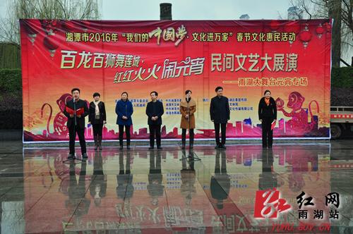 红网雨湖站2月23日讯(分站记者 谢岳峰)“春风化雨三严三实强根本,瑞雪临湖常创常新奔锦程!”2月22日是农历正月十五,是中华民族传统的元宵佳节。当天上午,湘潭市2016年“我们的中国梦·文化进万家”百龙百狮舞莲城,红红火火闹元宵,民间文艺大展演雨湖区专场在白石公园激情上演。雨湖区委书记刘永珍出席并宣布活动正式开始。区委副书记、区长何锋出席活动并致辞。湘潭市文体广新局副局长娄向前,区委常委、宣传部长夏建波,区委常委、副区长唐世荣,区政协副主席章果,区政协副主席、区文体局局长陈滔出席活动。夏建波主持启动仪式。