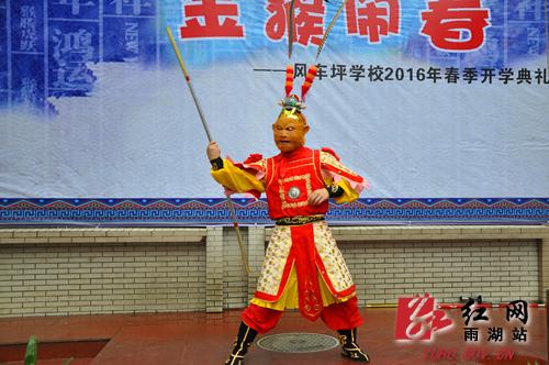 红网雨湖站2月24日讯(分站记者 谢岳峰)“快看快看!美猴王来啦!”2月24日上午,在湘潭雨湖区风车坪学校操场上,“美猴王”的到来引来了同学们的一片欢腾,让大家一饱眼福。当天,在该校的开学典礼上,除了有美猴王的精彩表演,学校独轮车、书法等社团开展的一系列富有中华传统文化的演出为学生们带去了特别的第一堂课。开学典礼在庄严的国歌声以及欢快的风车坪校歌声中正式开始。随着一群头戴猴子面具的孩子欢快地跑进场内,学校独轮车社团的学生化身“猴子猴孙”,手拿金箍棒,踩着独轮车给大家带来了精彩的表演。就当孩子们被脚踏“风火轮”,围绕在操场的“猴子猴孙”所吸引时,“美猴王”的惊艳出场引来大家的一阵欢呼。湖南省京剧团非物质文化遗产传承人任晋湘老师扮演的美猴王耍棍、翻跟头、倒立,一系列动作一气呵成,干脆利落,将猴王的灵气扮演得活灵活现,现场的学生无不拍手欢呼。