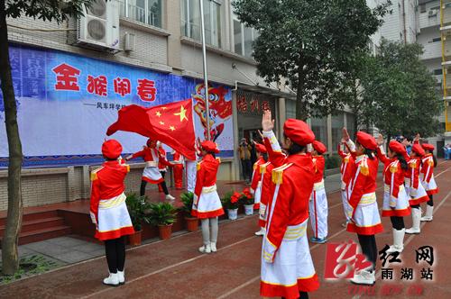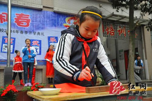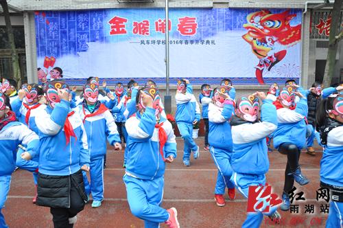 近年来,风车坪学校在学生活动中十分注重中华优秀传统文化的探寻和传承,今年该校的开学典礼便是围绕十二生肖这一中国传统文化展开。在美猴王与“猴子猴孙”的表演结束后,学校老师走上台,向学生们娓娓道来猴年的传说,让大家明白了生肖猴的来历和文化象征意义。随后,该校领导依次上台以礼、诗、书、画、武、乐为主题的学校国学“新六艺”为大家送上新春的祝福。同事,学校书法社团的学生也大显身手,现场创作,将“福”送到了每一个班级。