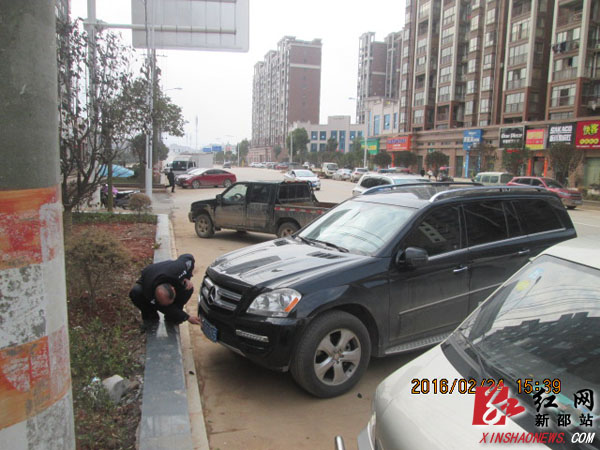 红网新邵站2月25日讯(分站记者 隆清泉 通讯员 邓凭凭)违章算别人的,出了事故可以一跑了之,盗用他人车牌信息的“套牌车”正如过街老鼠人人喊打。2月24日,新邵县交警大队查处了一起价值百万的奔驰套牌豪车,受到了当地老百姓的一致好评。当天下午3点左右,新邵交警大队酿溪中队民警肖四芳、刘斌划、向方勇在新邵县城区进行交通巡逻时,发现了一辆悬挂粤CRG905的奔驰越野车停放在酿溪镇七秀路。民警们发现该辆车号牌在交警大队春运期间机动车违章通报中曾多次出现。凭着多年的职业敏感和细心观察,民警断定此车“有问题”。