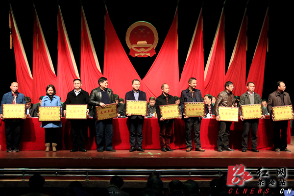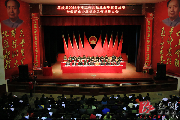 红网茶陵站2月27日讯(分站记者 吴清远)2月26日,茶陵县2015年度工作总结表彰暨扶贫攻坚全面建成小康社会工作推进大会在县影剧院召开。会议总结表彰2015年度工作,再动员、再部署脱贫攻坚全面建成小康社会工作,号召全县上下团结一心,众志成城,为全面脱贫、全面建成小康,实现“中心县”目标而努力奋斗!全县县、乡、村三级干部千余人参加会议。上午8:30,会议在雄壮的国歌声中开幕。茶陵县委书记彭新军作了《真抓实干精准发力为实现全面脱贫、全面建成小康社会目标而努力奋斗》的主题报告。