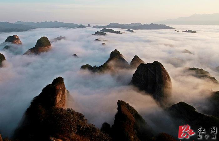清晨起,云雾开始在八角寨脚下的丹霞峰林峰丛间弥漫开来,慢慢地像在大地上铺上了一层厚厚的白雪,又像是成片的海水中包围了整座岛屿。早上7时许,太阳从东方慢慢升起,红色的阳光将石峰、树林、寺庙,以及山脚下白色的云层都染成了绛红色,山顶的游客仿佛进入了梦幻般的仙境之中……几位第一次看到崀山“鲸鱼闹海”壮美风光的女游客激动不已,纷纷拿出手机拍照。
