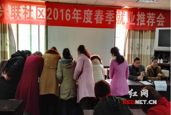 红网长沙2月29日讯(通讯员 李建兵)为更好地帮扶辖区失地居民实现“家门口就业”的需求,2月28日上午,长沙市开福区秀峰街道联合辖区内几家知名企业家单位,在街道兴联社区组织开展“送岗位进社区”春季就业推荐会。“招聘会9点开始,我8点多就过来了,现场有这么多单位招人,相信一定能找份满意的工作”。来自该社区母山小区的刘女士说道。参与此次招聘的企业单位提供了客服专员、行政助理、工程维护工、水电维修工、安保员、保洁员等40多个工作岗位,工资也普遍在2000元左右。社区有近百名居民前来应聘,20余名居民通过本次就业推荐会将实现就业。