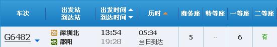 G6482次由深圳北开往邵阳,13:54从深圳北发车,历时5小时43分抵达邵阳站。