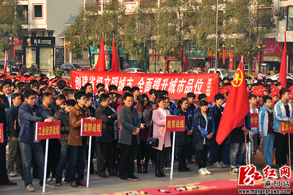 红网麻阳站3月2日讯(通讯员 陈建武 黄黎)3月2日,由麻阳县委宣传部、县教育局、团县委、县妇联、县文明办联合主办的“创文明城、做文明人”主题志愿服务月活动启动仪式在县锦江广场举行,此次活动将组织和引导广大志愿者以实际行动投身省级文明县城创建,争当文明行动的倡导者、文明行为的践行者、志愿精神的弘扬者。麻阳县委副书记毛运鸿、县委常委、宣传部长鲁鸿、县委常委、副县长郑阳松出席活动。活动由麻阳县委常委、副县长郑阳松主持。麻阳县委常委、宣传部长鲁鸿指出,创建省级文明县城是县委、县政府做出的一项重大决策,是加快实现建设生态长寿苗乡目标的一项重要举措,也是事关经济社会发展大局、事关广大人民群众切身利益的一项系统工程。文明创建,人人有责,更离不开全县广大志愿者的积极参与和无私奉献。希望全县各部门、各单位、广大志愿者,要争当文明行动的倡导者,倡导市民讲文明语言,行文明礼仪,养文明习惯,树文明形象,传播文明的信息,谱写和谐的乐章。要争当文明行为的践行者,并通过活动提升麻阳人民的精神,真正使麻阳的文明创建达到一个新高度,真正使我们的思想境界得到一个提升。争当志愿精神的弘扬者,树立人人都是形象,自我约束,严于律己,自觉投入到创文明城,做文明人的活动热潮中。