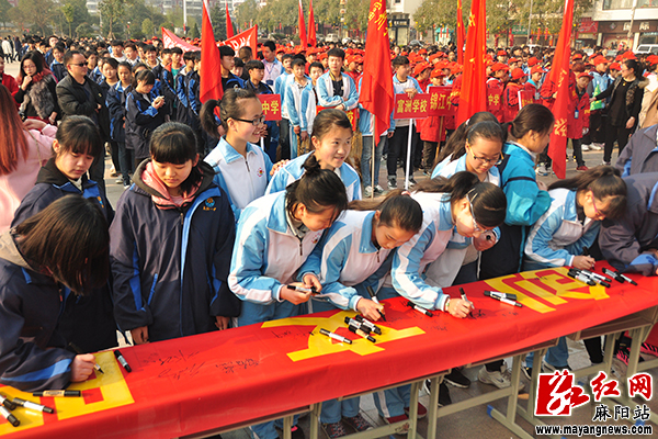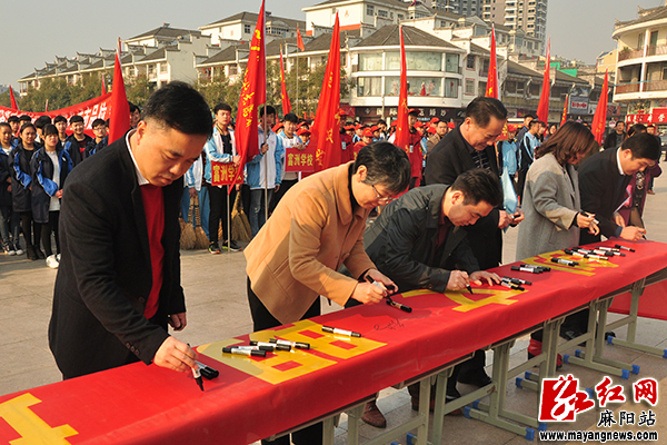 启动仪式上,麻阳团县委负责人宣读了《“创文明城、做文明人”志愿服务活动倡议书》,呼吁大家自觉行动、身体力行,争当创建文明县城的践行者、志愿者和推动者。志愿者代表作表态发言,表示要以实际行动践行对“创文明城做文明人”的承诺。县委副书记毛运鸿为县志愿者联合会进行授旗,并宣布此次活动正式启动。毛运鸿、鲁鸿、郑阳松和来自各行各业1000多名志愿者在宣传横幅上郑重地签下了自己的名字,表达坚决支持创文明城、做文明人的决心。