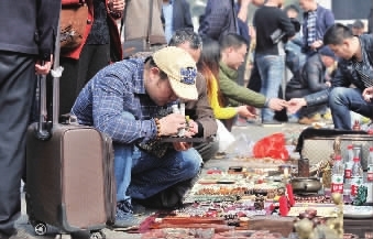 3月4日上午,长沙市天心阁古玩城,收藏爱好者在地摊上“淘宝”。当天,天心阁古玩城2016年春季古玩交流会暨地摊文化节开幕,来自全国各地的参展商及收藏爱好者齐聚古玩文化广场,现场进行古玩交易。据了解,本次活动共设置了600个摊位与部分精品展柜,将持续到3月6日,活动期间还同期举办古钱币展。 记者 田超 摄
