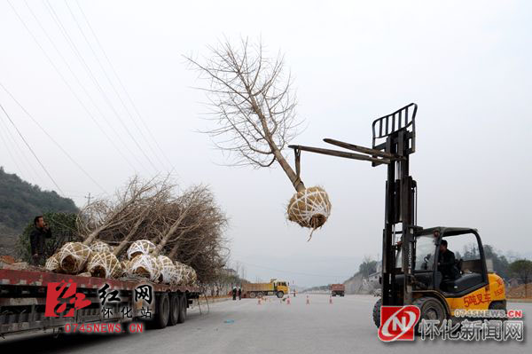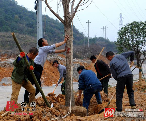 红网怀化站3月9日讯(通讯员 王桦)“一、二、三,起!”拉绳子的黄师傅一喊完口号,五名施工人员便齐力将地上碗口粗的银杏树朝黄师傅拉绳子的方向竖起。待确定树木垂直后,便抽出三名施工人员拿起地上的铲子,往树坑里填土。前方20米处,杨师傅和其他几位工友正给横在地上的银杏树修剪枝条……近日,春风细雨,正是植树好时节,城东高速公路延长线的施工现场,施工人员正在种植绿化带的苗木。3日中午12点,天开始下起小雨,风越刮越大,气温越来越低,然而,这丝毫没有影响施工人员的热情。叉车依旧来回开动,将拖挂车上的银杏树一株一株取下并运至已挖好的树坑旁。装运车将一车车的种植土倒在绿化带处,小型挖机开始平整倒下的种植土。