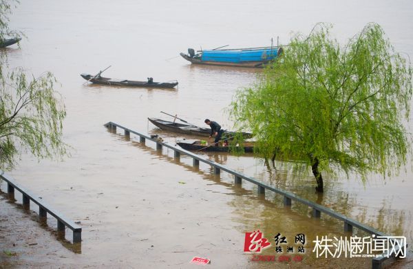 涨水后,渔船停靠在风光带人行阶梯附近。(株洲日报记者 易翔 摄)