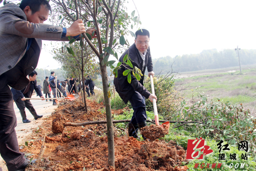 长沙市望城区委书记孔玉成(右)与大家一起种下一棵棵小树。(刘赛 摄)