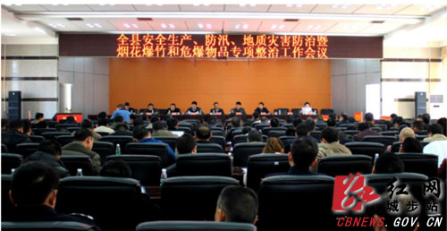 县委常委、副县长、统战部部长杨锡英主持会议。县委常委、常委副县长杨映林作安全生产和烟花爆竹、危爆物品专项整治工作报告。副县长、公安局长罗静宣读《烟花爆竹和危爆物品专项整治行动方案》。