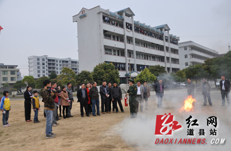 在道县教师进修学校,消防官兵组织老师、学生们参与了消防器材装备展示、灭火体验等项目。此外,活动现场还进行了火灾应急疏散演练,当火警信号在校园广播响起后,3至6年级近2000名学生在消防官兵和老师的指挥指引下,捂鼻弯腰有序地按预定疏散路线撤离,3分多钟即到达操场安全地带。清点好队伍后,消防官兵为师生们讲解了火灾时的应急自救方法和灭火器的使用方法等消防安全知识。