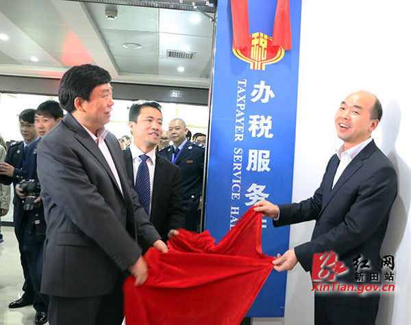 永州市国税局长曾立春、永州市地税局长毛东庆、新田县县长秦山成为新田县国地税联合办税服务厅揭牌