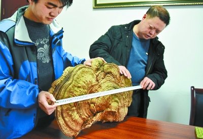 该灵芝菌盖很粗糙,上面有大小不一的小灵芝,菌表面呈深褐色。经测量,灵芝长74厘米、宽39厘米、高15厘米,重达10.72斤。所见之人,无不称奇。