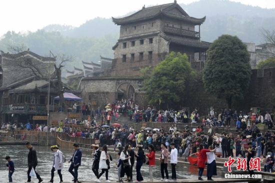 4月2日,正值清明小长假首日,湖南凤凰古城内人头攒动,沱江泛舟景点更是排起了长龙。自4月10日起,湖南凤凰古城暂停景区验票,保留景点验票方式。新的“门票政策”并未影响游客出行计划,游客纷纷来到古城内游玩。