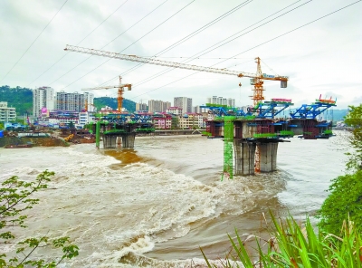 4月6日,澧水洪峰通过张家界市城区段,在建中的澧水新桥及高架桥为此受到影响。当天,受强降雨影响,张家界市境内多处暴发山洪。 庹年矿 摄