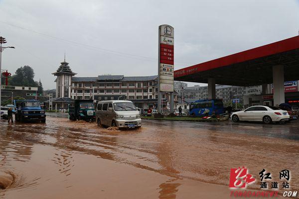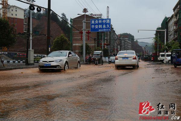 红网通道站4月13日讯(分站记者 粟汇华 秦玉姣 韦祯含)4月12日,上午10点,通道普降暴雨,局部地区出现特大暴雨,全县最大降雨量高达121.5毫米,城区降雨量达59.2毫米以上,部分街道被淹没。记者发现,在城东中国石化加油站旁地势较低的路段,地下排水管道受阻,蓄积了一些雨水,给出行的市民带来不便。“我们骑电瓶车在这个路口遇上红绿灯,一只脚都不知道往哪里放。”一名正在等红绿灯的女士发起了牢骚。随后,记者围绕县城走一圈,发现几条主要干道被雨水淹没,淤泥、垃圾堆满路面。