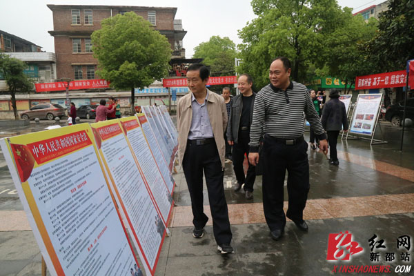 新邵县委常委、政法委书记刘爱民(左)和副县长、公安局长钟彪(右)在观看宣传展板