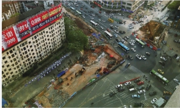 4月18日,正在建设中的长沙地铁4号线黄土岭站。该站位于芙蓉中路与黄土岭路交叉路口处,沿黄土岭路呈东西向布置,是最难施工的站点之一。车站与沿芙蓉中路南北向布置的地铁1号线黄土岭站“十字形”换乘。目前,该站4号线部分在进行地下连续墙施工,预计6月底可完成。 记者 赵持 摄影报道