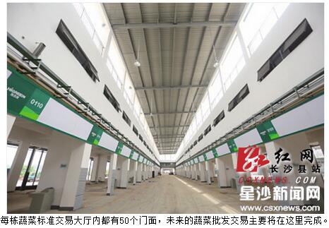 即将开业的项目一期之中,除了6栋蔬菜标准交易大厅,还设置有2栋宽敞的对车交易区,可供两台货车朝相反的方向拼起来进行交易,以及2栋本地菜交易大厅、2栋综合大厅、1栋城市配送中心、3栋沿街商业楼,可基本满足马王堆蔬菜批发市场搬迁需求。