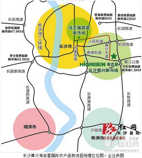 新市场优越的交通区位优势是一大特点,这里位于长株高速、京港澳高速、长永高速、机场高速交会处,紧临长沙绕城高速,西临长沙火车南站、东接黄花国际机场、南邻长沙市三环线,交通十分便利,可辐射全国31个省、市、自治区,有效保障中南地区的农产品供应。