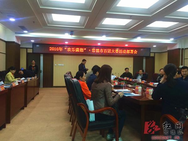 红网常德站4月26日讯(分站记者 黄刚)4月26日,2016年常德市百团大赛活动部署会议在常德广电会议室举行。会议指出,7月31日前完成县级初赛选拔,8月份举行市级决赛,9月份将参加全市文艺汇演决赛。本次活动由常德市委宣传部、市文体广新局、市广播电视台举办,市文化馆和电视台具体承办。大赛按照县级初赛、市级决赛层层比赛逐级竞级的方式进行。以完美社区和美丽乡村广场为演出平台,实现演艺惠民。