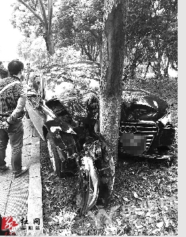 红网岳阳站4月26日讯(分站记者 童滢滢)昨日下午4点左右,一辆黑色奥迪A6轿车在岳阳市通海路上由西向东撞上刚建的公共自行车位,最后撞上绿化带中的一棵树。A6车头损毁严重,树伤的也不轻,但司机却不见了。现场没有发现刹车痕迹和血迹。围观市民告诉记者,估计当时车速至少超过100码。但具体事故原因还没有证实。