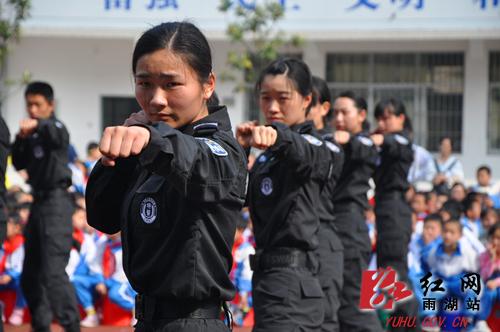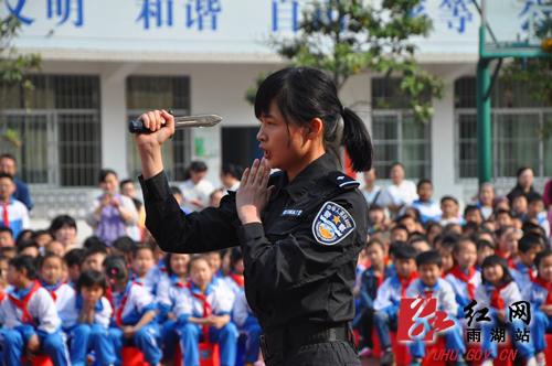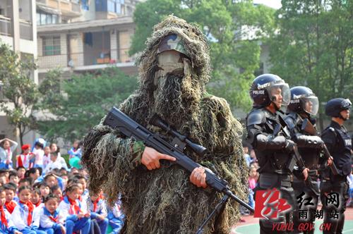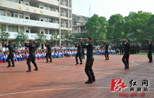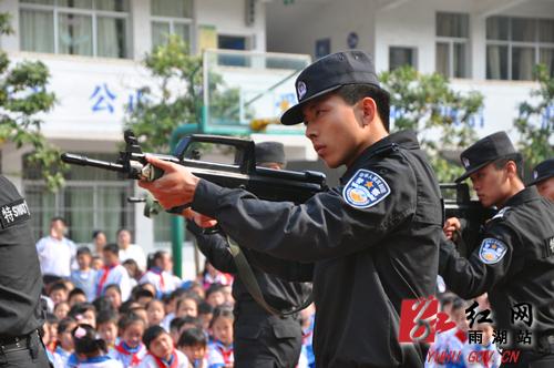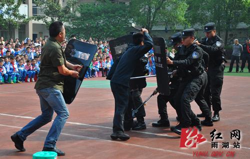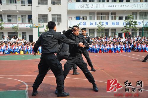 活动现场,特警队员展示了92式手枪、警用转轮手枪、97-2防暴枪、狙击步枪、79式微型冲锋枪等各种新型警用装备,通过女子匕首操、枪战术、应急棍术、伸缩警棍术和擒敌拳等精彩的基本战术表演以及和孩子们的互动,在轻松愉快的氛围里教会了学生们一些安全常识,并与学校保安、护校队员共同模拟了校园暴力事件处置。特警队员矫健勇猛的身姿、制服“犯罪嫌疑人”时的从容镇定,让孩子们“大开眼界”,直呼过瘾。