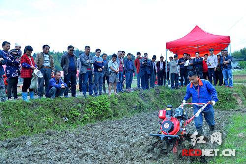 红网隆回4月28日讯(通讯员 贺上升 欧阳水平)4月27日,湖南省隆回县农机局与某农机有限公司联合厂家,在金石桥镇举办2016年微耕机新产品推广现场演示会。当天,来自四川、重庆等地的微耕机生产厂家对20多款微耕机新产品进行稻田、水田和旱土翻耕操作演示,县农机局领导和当地群众近100人观摩。