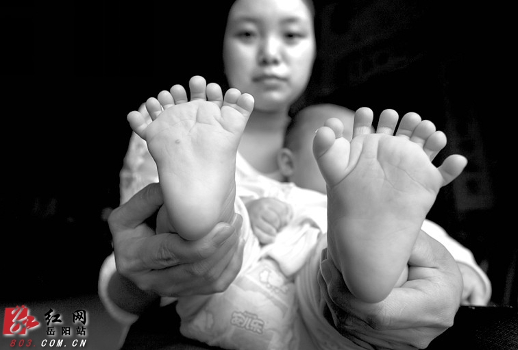 5月1日,记者在平江县南江镇中坪村见到了被妈妈抱在怀里的弘弘。如果不看手指、脚趾,3个月的弘弘看上去天真可爱,与正常的婴儿没什么两样。