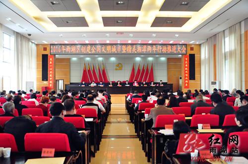 红网雨湖站5月11日讯(分站记者 陈娟)5月10日,2016年湘潭市雨湖区创建全国文明城市暨精美湘潭两年行动推进大会召开。雨湖区委书记刘永珍主持大会,她强调,要以决战决胜的勇气和信心全力以赴,要以扎实务实的作风抓好工作的落实,要以善做善成的态度确保工作圆满完成。区委副书记、区长何锋作动员报告,区人大常委会主任罗扬义、区政协主席曾彩奕及区领导周复明、王振华、夏建波、赵波、唐世荣、刘奖红在主席台就座。今年以来,湘潭市声势浩大地启动了精美湘潭两年行动,决胜全国文明城市创建,将通过两年大奋战,实现城市大变化,把湘潭建设成为干净卫生之城、整洁有序之城、畅通便利之城、品质品位之城、精到精致之城、心齐气顺之城,打造湘潭人民有舒适感、有归属感、有自豪感的美丽家园。精美湘潭两年行动,将在基础设施建设、两房两棚、两供两治等方面,实施一大批项目,是改变老城区形象、提升城区承载力和美誉度的核心机遇。这将彻底改变雨湖基础设施薄弱的现状,更好地实现精美宜居雨湖的目标。在“精美湘潭两年行动”中,涉及雨湖区的建设项目有46个,计划投资198亿元。