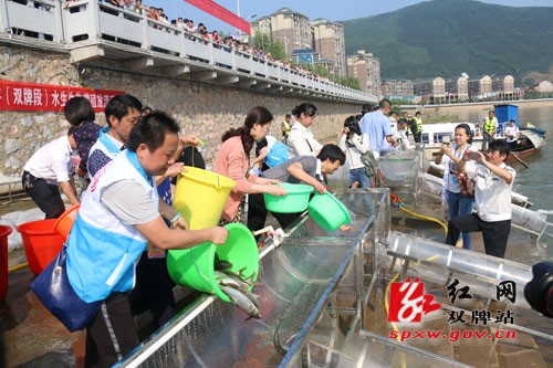 红网双牌站5月12日讯(通讯员 周凌文)5月12日,2016年湘江上游水生生物增殖放流活动在湖南省双牌县日月湖国家湿地公园县城段举行。本次放流活动共向潇水河投放“四大家鱼”苗种600万尾,为湘江水域生态平衡、生物多样性提供了保障。本次活动由省畜牧水产局主办、双牌县政府承办,省畜牧水产局局长袁延文出席活动并宣布放流活动开始。县领导苏小康、李瑛、邓美英、蒋爱先、蒋建辉以及部分人大代表、政协委员,渔民、志愿者代表、县农口系统干部职工和部分市民参加了活动。