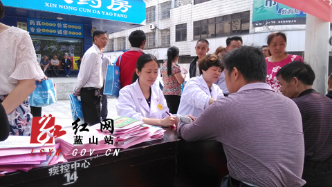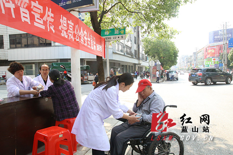 红网蓝山站5月13日讯(分站记者 何明贵 通讯员 彭晶)5月12日是国际护士节,为更好地普及防灾减灾知识,提高市民自护自救的能力,湖南省蓝山县卫计委、县中心医院、疾控中心、红十字会等卫生系统的共百余名“白衣天使”走上街头开展应急知识大型宣传义诊活动,对市民进行健康宣传。