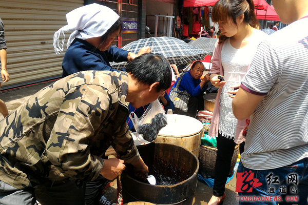 红网通道站5月14日讯(通讯员 李尚引)5月14日(农历四月初八),是湖南省通道县一年一度的“黑饭节”。在通道县街头巷尾,许多侗族妇女正在售卖侗乡黑米饭,黑米四处飘香,节日气氛十分浓厚。笔者在通道县城东大市场看到,用木桶蒸制熟的各式“黑米饭”随处可见,前来购买“黑米饭”的居民也络绎不绝。农历四月初八吃“黑米饭”,是通道侗乡千余年来保留至今的古老习俗。