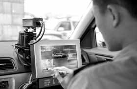 从外观上看,“隐形战车”是一辆白色普通私家车,挂民用车牌。但走近发现,在副驾上装了一台嵌入式的电子显示屏,控制台上还装着一个圆台和一个摄像头,副驾驶上的乘客是身着制服的机动大队民警谢吉祥,在他手上,还握着类似于遥控器一样的小键盘。这套设备就是“隐形战车”的主要设备,摄像头是高清的,有200万像素,圆台可以旋转250度,摄像头可360度旋转,小键盘学名叫三维摇杆键盘,可以调控摄像头和画面。