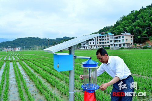 红网隆回5月29日讯(通讯员 贺上升)5月29日,湖南省隆回县羊古坳乡袁隆平第五期超级稻高产攻关实施人王化永,在雷峰村试验基地清理太阳能自动清刷杀虫灯里的害虫。今年5月下旬,王化永从长沙购进6盏太阳能自动清刷杀虫灯,安装在108亩“超优1000”超级稻田间,为实现水稻生态环保节能灭虫和争创第五期高产目标奠定了基础。
