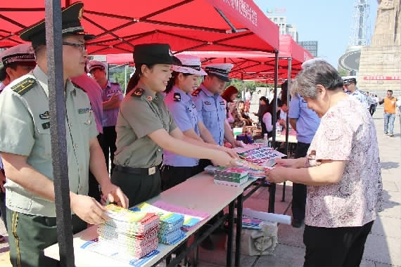 ▲株洲市消防支队官兵向群众发放消防宣传资料。