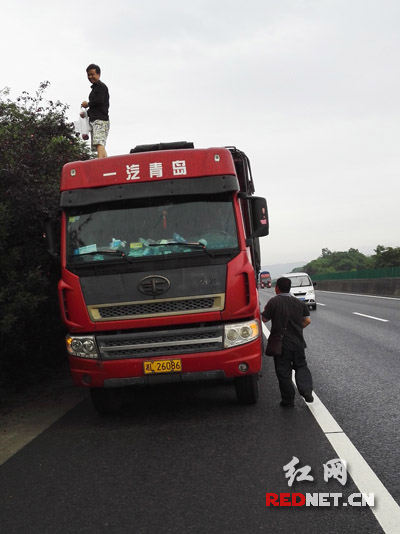 继续往前巡逻,民警发现又有一辆湘潭牌照的小车停在港湾内,一名女子手上拿着一袋刚摘下来的李子,路边李树有多处树枝存在人为折损痕迹。民警对其进行批评教育,要求其马上离开。这时,突然下起了暴雨,民警发现还有一对男女正在冒雨采摘李子,车辆竟然随意停在应急车道上,存在重大安全隐患。由于驾驶员王某涉嫌违法停车,民警对其处以200元罚款、驾驶证记6分的处罚。民警还向笔者出示了一张照片:一台牌号为湘L26×××的货车停在应急车道上,司乘人员竟然站在货厢上采摘李子。民警依法对该车进行了违法录入。