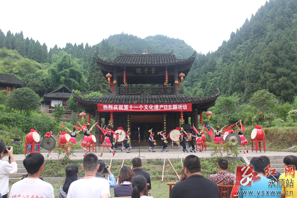 红网永顺站6月13日讯(通讯员 刘波 刘国胜)6月11日,湖南省永顺县在老司城遗址摆手堂举办主题为“让文化遗产融入现代生活”的“文化遗产日”主题宣传活动,数百名游客和司城村村民一起参加了庆祝活动。永顺县土家艺术团表演了打溜子、哭嫁歌、摆手舞等国家级非物质文化遗产保护项目,把文化遗产融入到日常生活中,让广大群众近距离领略非物质文化遗产的独特魅力。
