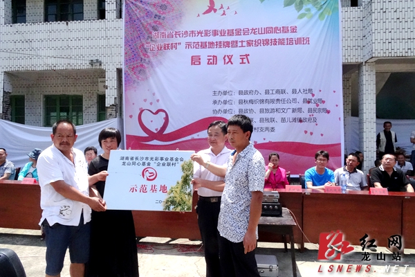 活动中,湖南省长沙市光彩事业基金会龙山同心基金会企业家联合为苗儿滩镇六合村10户建档立卡贫困户共捐款1万元扶持资金,并为六合村授“湖南省长沙市光彩事业基金会龙山同心基金'企业联村'示范基地”牌子。