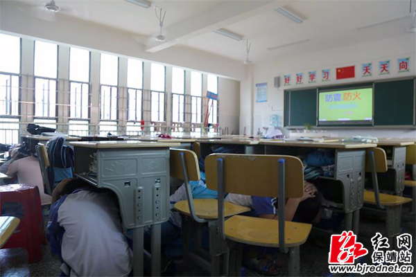 下午3点,演练的警报声响起时,指挥长李凡志老师宣布“地震应急疏散演练开始,现在地震来袭,紧急避险。”各班学生在任课教师的带领下,有秩序地迅速躲进教室较安全的课桌下,双手护头以保安全。