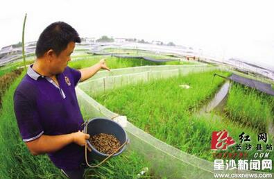 红网长沙县站6月23日讯(星沙时报记者 廖真怡)30亩的水田内,上方是一块白色的薄纱网用来防蛇防鸟,下面则是青蛙宝宝们的栖息地。“开餐”时间到,只见饲养员手提塑料桶,将白色、棕色的虫子撒入田间的托盘,一时间一大波拇指大小的青蛙便陆续从草丛中窜出,纷纷抢食。