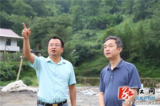 桑植县委书记刘卫兵(右)在桥自弯镇岩塔村集中安置点实地查看