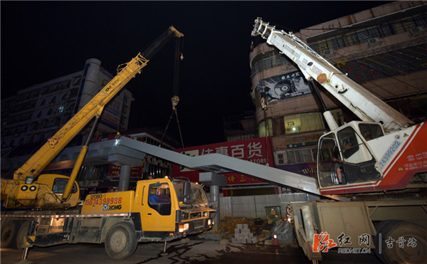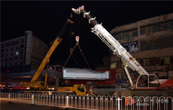 红网吉首站6月26日讯(通讯员 黄燕)“大家注意安全,吊车司机按照指挥人员手势将梯道放到指定位置。”6月24日零时,湖南吉首城区文艺路人行天桥北侧梯道吊装工作有条不紊地进行着。