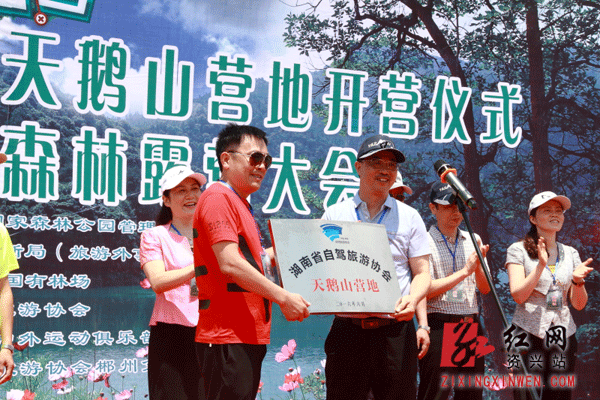 会上,湖南省自驾旅游协会会长杨国林授予“湖南省自驾旅游协会天鹅山营地”牌匾。自驾游会员和到场嘉宾、游客还进行了环保宣言集体宣誓:呵护一草一木,保护这山这水,永葆碧水蓝天!
