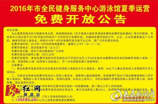 红网娄底站6月28日讯(通讯员 刘洪霞 刘志红)夏日炎炎,酷暑难当,在清凉干净的泳池中畅游一番,是一件多么惬意的事情。6月28日,笔者从湖南省娄底市全民健身服务中心获悉,今年全民健身优惠继续来袭:2016年7、8月每周星期五、星期六的上午9点半到11点半,市全民健身服务中心游泳馆对广大市民免费开放室外池。这是自2014年以来,市全民健身服务中心游泳馆室外游泳池(由游泳馆西南门入口进)连续第三年免费向市民开放。