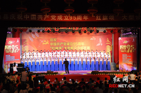 蓝山县“红旗颂”大型群众合唱比赛由蓝山县委组织部、县委宣传部和县直属机关工委联合主办,县文体广新局承办,是蓝山县“欢乐潇湘”群众文艺汇演和纪念共产党成立95周年的重头戏。活动自今年4月启动以来,受到了广大党员干部和群众的热烈欢迎。比赛现场,既有来自企业一线的青年员工,又有来自党政机关部门的党员干部;既有来自学校和文艺团体的文艺骨干,又有来自执法部门的业务骨干,年龄最大的80多岁。参赛歌曲以百首爱国主义歌曲为主,既有《游击队歌》《英雄们战胜了大渡河》等慷慨激昂的革命歌曲,又有饱含深情的《春天的故事》《在灿烂阳光下》《天路》等旋律优美的通俗歌曲;既有《走向复兴》《中国人民解放军军歌》等雄浑嘹亮的军旅歌曲,又有《没有共产党就没有新中国》等京剧表演,比赛现场成了一片红色的海洋。