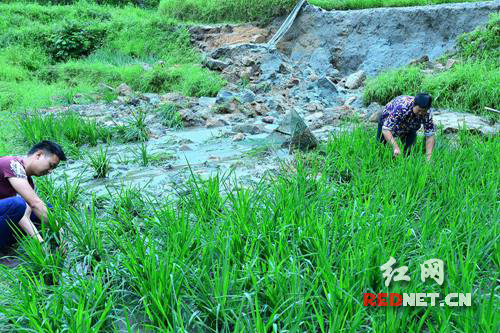 农民在水毁稻田开展灾后生产自救。