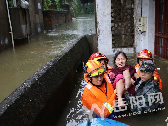 红网岳阳站7月5日讯(岳阳日报记者 许铭 通讯员 罗宁)7月4日上午,湖南省湘阴县遭遇洪灾,通达湖、安邦华城等地全线积水,周边居民区一楼被积水淹没,最深处达到1.6米。其中一位老奶奶身体残疾,且身体状况较差,被困家中。接到报警后,湘阴消防出动了两辆消防车和14名消防员,火速赶赴现场救援。