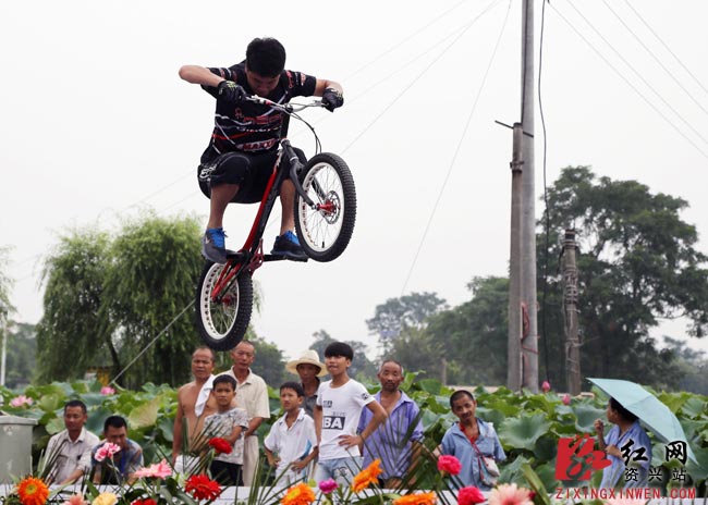 与此同时,花式骑行特技表演也在流华湾游客集散广场精彩上演。五名专业的自行车特技表演者娴熟地摆弄着手中的自行车,或“噌”地跃上舞台,或猛地飞下舞台,或原地打转,劲爆的表演引来游客们的阵阵喝彩,大家纷纷用相机或手机记录下这精彩的瞬间。